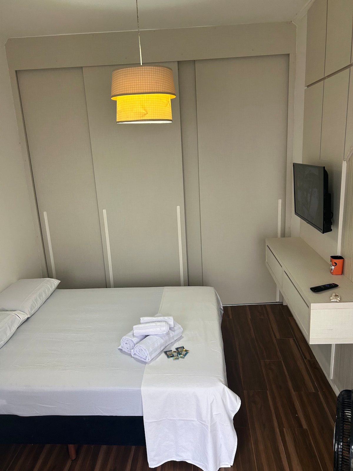 Suíte ampla com entrada independente. Cama Queen Size, Cama de Solteiro, Banheiro Privativo, Ventilador de Teto, Wi-Fi, Varal de chão e Mesa para Refeição. O quarto possui também uma pequena estrutura para o preparo de café da manhã ou lanches simples (frigobar, micro-ondas, cafeteira elétrica de coador, sanduicheira, omeleteira, pia e alguns utensílios). Não permitimos o uso de fogão elétrico ou a gás. Fornecemos roupas de cama e banho. Estacionamento Interno e Coberto