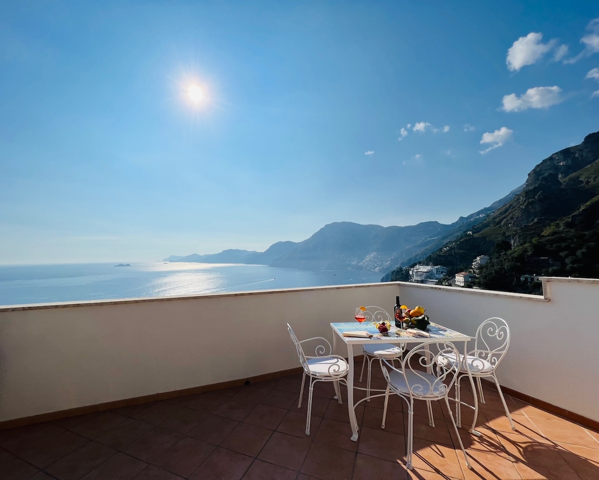 Appartamento completamente arredato. Dotato di 1 camera da letto (matrimoniale), 1 bagno con doccia e lavatrice, ampio soggiorno (con possibilità di 3° letto aggiunto), cucina attrezzata, ampio soggiorno con fantastica vista mare e di Positano. L'appartamento è situato al inizio della scala che porta al SENTIERO DEGLI DEI ed e ‘ accessibile tramite 250 scalini , l appartamento e’ adatto a persone giovani , abituati a fare esercizio fisico!non adatto a persone anziane!