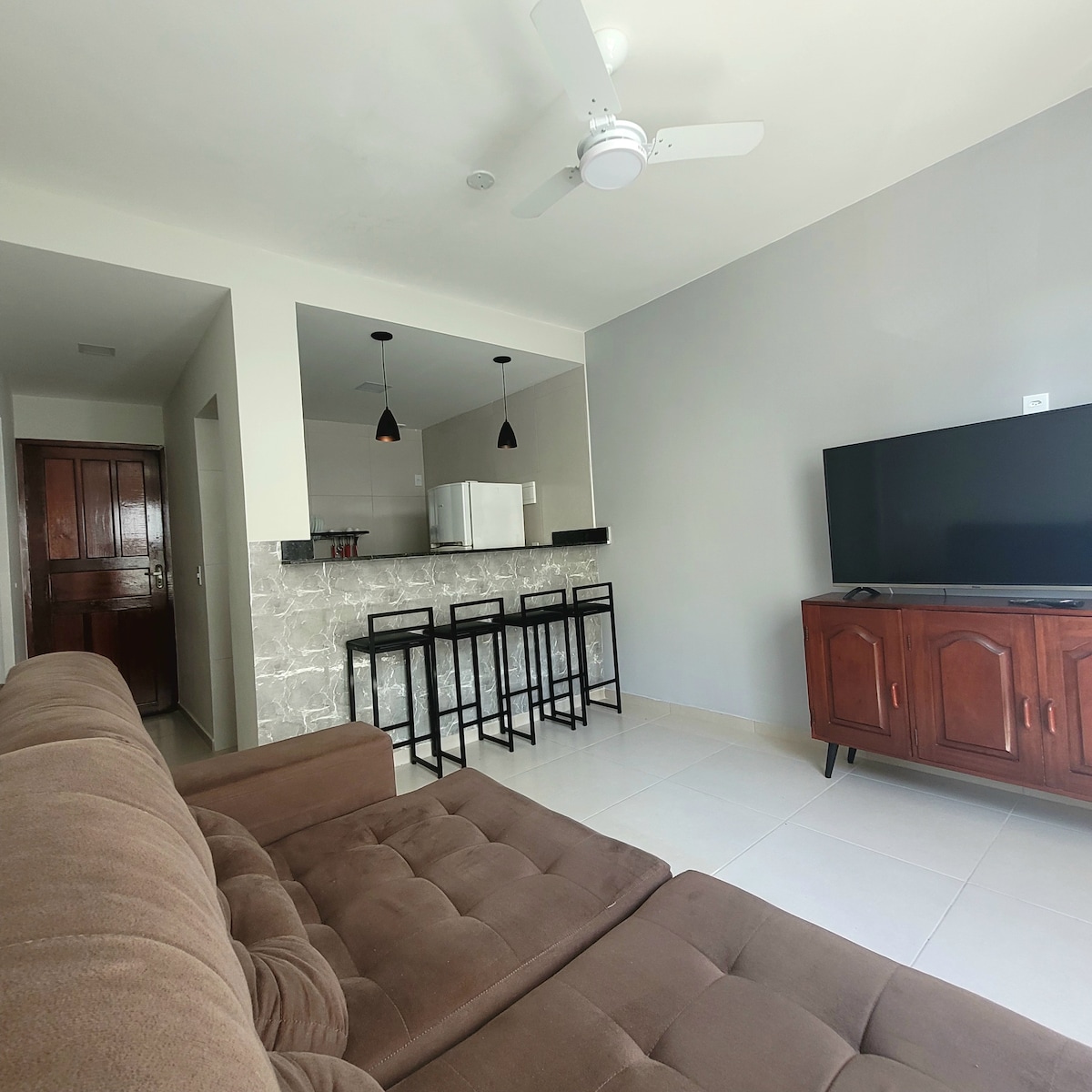O apê de um quarto, reformado recentemente, possui tudo para uma estadia boa e tranquila, a começar pela vista da janela e o barulho do mar. Ele dispõe de um quarto com uma cama de casal, 2 colchonetes, uma mesa para montar o seu café da manhã apreciando a vista, um banheiro, uma cozinha equipada, Wi-fi, TV Smart 43' no quarto, e um sofá-cama na sala. Oferecemos roupa de cama e banho para maior conforto e comodidade.