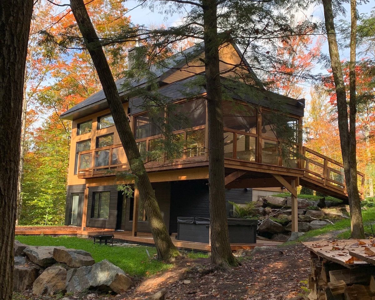 Chalet en pleine nature avec vue sur la montagne. Spa extérieur couvert ouvert à l’année, foyers au bois intérieur et extérieur, planchers chauffants et BBQ. Cuisine complète avec café inclus. Trois chambres : suite des maîtres avec lit king et foyer au gaz, 2e chambre avec lit queen et mezzanine avec lit queen. Terrain de 5 acres avec 2e phase locative prévue en 2026. Parfait pour vous ressourcer. No enr. 309551 exp. 2026-06-08.