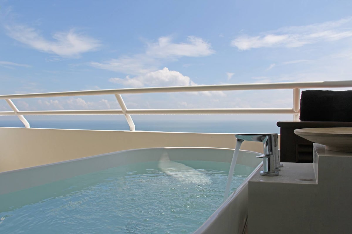 BEACHFRONT RESORT APARTMENT WITH AMAZING SEA & MOUNTAIN VIEWS This truly amazing beachfront apartment is located on a private beach with stunning views. 2 bedrooms, 2.5 bathrooms, large living room, kitchen, terrace lounge and two sea view hot tubs