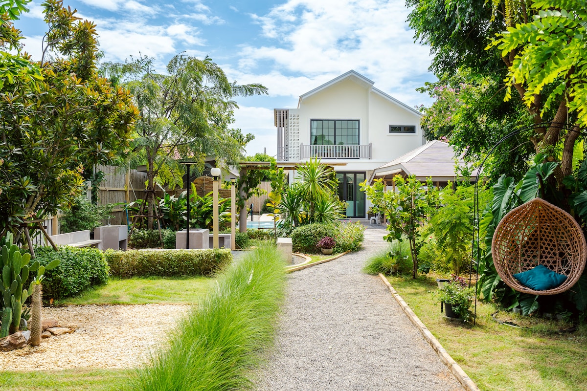 Pool villa which 5 minutes walk to the beach. Beautiful garden among Nordic and Thai colonial house style. Mountain surrounded around the area. Suitable for family with kids.