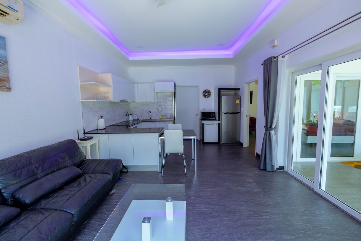 Beautiful one-bedroom villa with a private pool that is not overlooked. Suitable for 2 people, with a bedroom and bathroom that are linked, a kitchen that is fully equipped, 2 Smart TVs, private, cost-free high-speed Wi-Fi, and sun beds on the covered terrace. The villa has free parking in front of it. Only five minutes on foot will get you to the beach from the village. The distance to the city center of Pattaya is only 2 kilometres.