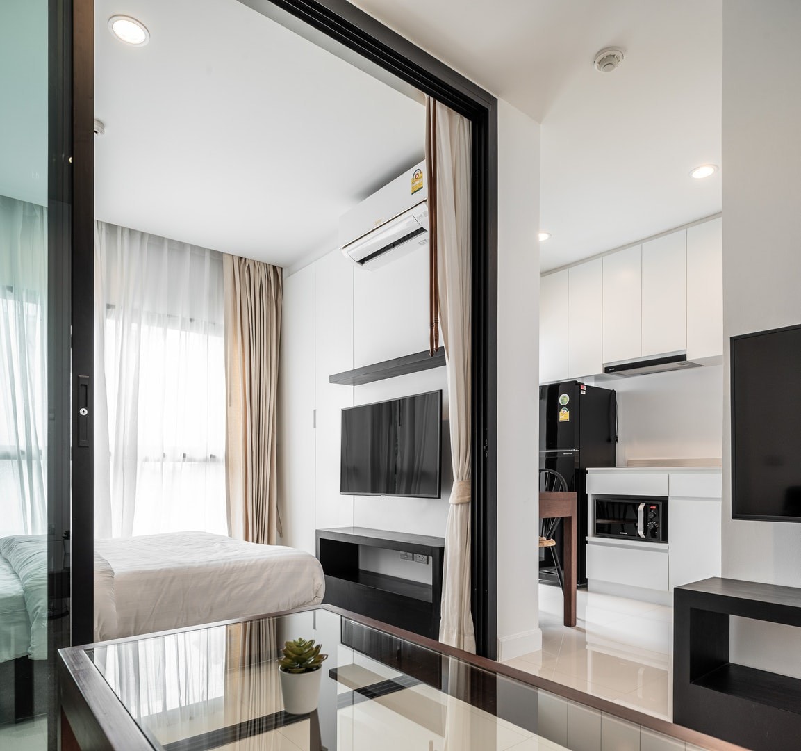 -45 sqm studio apartment with kitchen and balcony. -Non Smoking / No Cannabis -One king-size bed -5 minutes walk from BTS Sanampao (N4), exit#3 -Private bathroom with shower, hairdryer, toiletries and towels -Air-con/ Free Wifi/ TV -Safety deposit box -Living area with sofa -Free Luggage storage -24-hour security -Easy check-in/check-out -Free parking spaces -Swimming pool & fitness *Rate shown is for 2 guests, extra guest is THB 500 per night. Please put number of guests to check price