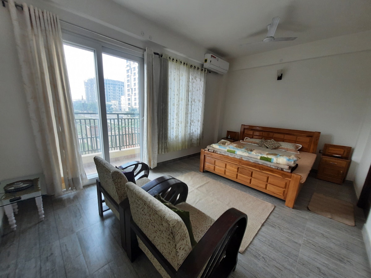 Cozy 2BHK Apartment – Balcony Views, AC & Free Wi-Fi Fully furnished 2BHK apartment with balcony for morning/evening tea (no kitchen). Ideal for families, seniors, professionals & travellers.