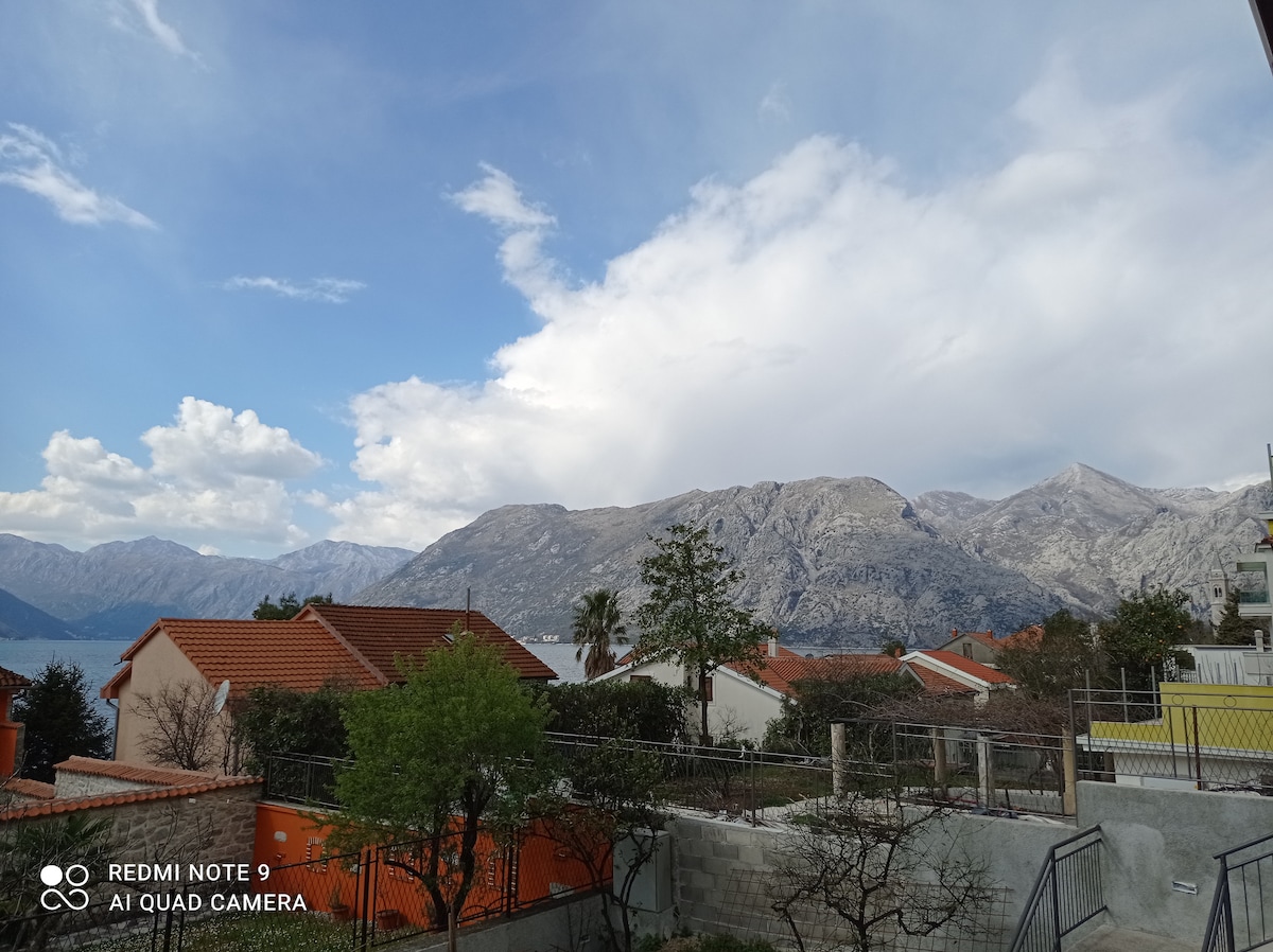 Beautiful apartment with great view on Boka Bay and Kotor. Apartment is modern furnished, has terrace ideal for relaxed stay with great location. Beach is on 50m from object. We are situated on 1.4 km away from Old town;going to Prcanj.Hospital,police and post are 300m away.Banks are in the Old town.Nearest supermarket is 300m away. Airports are on distance of:Tivat-7km,Podgorica-90km ,Cilipi(Croatia)-70km. Welcome , Kotor is living history in a spectacular bay