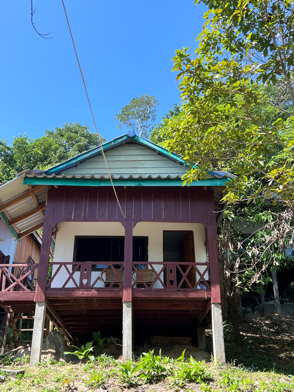 beautiful wooden bungalow at sok san long beach , room with a fan. Seaview from balcony and bed. quite nice clean location, you can reach any point of island easily, 2 minute walk to long beach, there are restaurant bars in the area