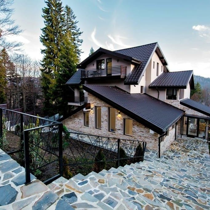 Enjoy the magnificent scenery in a private mountain resort, 5 min away from Brasov. The villa has huge terraces and balconies with spectacular mountain views and lots of comfy lounge chairs, Wi-Fi throughout the entire property, table tennis, table football, a large living room with fireplace, barbecue grill, covered outdoor dining place, a large variety of board games, on-site car park for up to 4 cars, including a garage. It is an ideal place to enjoy a relaxing holiday in Transylvania.