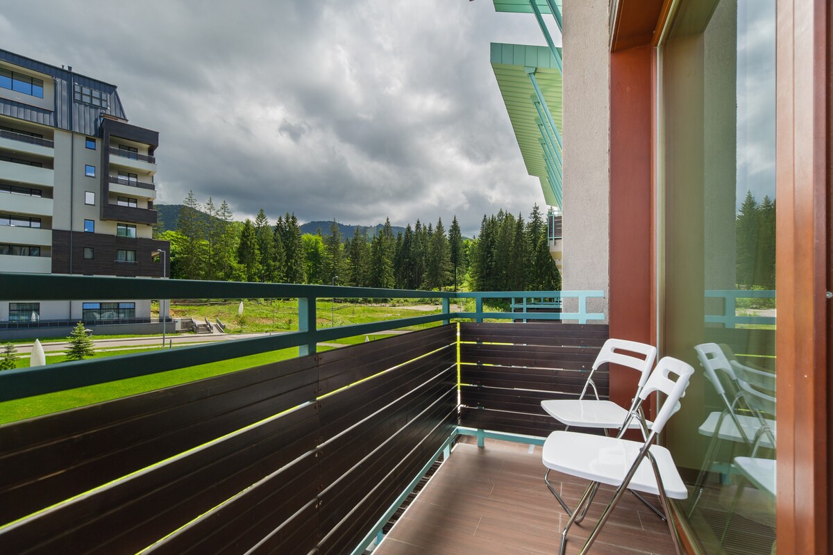 Situated in an exclusive area in Poiana Brasov, the Family Apartment in Silver Mountain offers panoramic views of the surrounding mountains and forests. The Family apartment can accommodate 6 people, located on two levels with the living room and two bedrooms. All rooms have their own bathrooms and terraces with superb views and in winter evenings, you can make the fire at the fireplace.