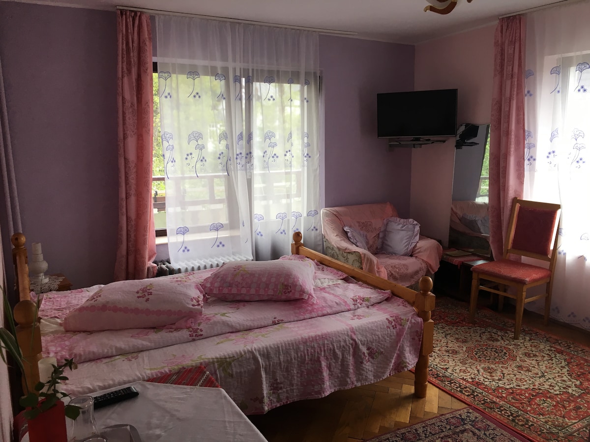 First floor studio with a nice terrace, located in a quiet area with a large open space room and a joint kitchen. This cozy and comfortable studio is fully furnished to the last detail as it was recently fully renovated. The place is perfect for families with children, couples or groups of friends. Coffee can be served on balcony while watching the stunning mountains. Easy walking distance of 10 mins to Bradu Ski Slope and close to the historic city Brasov (10 km).