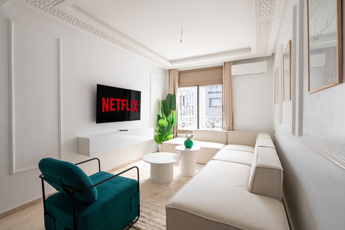 Discover refined living in this elegant Rabat apartment, nestled in a peaceful, secure residence with 24/7 security and private parking. Thoughtfully designed for comfort and elegance, the space features a cozy lounge, premium bedding, a fully equipped kitchen, and high-speed Wi-Fi for a relaxing stay. Ideally located in Upper Agdal, close to Sofitel, Descartes School, and Ibn Sina Forest, with cafés, restaurants, and boutiques just steps away—and the Medina only 10 minutes away.