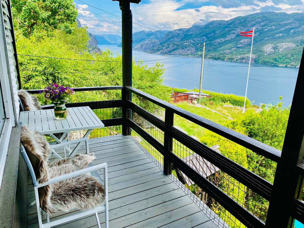 Preikestolen 10 minutter til parkering. Les anmeldelsene fra tidligere gjester. Utsikten er slående, stedet er skjermet fra trafikk og støy. Sol til klokken 22:20 på de lengste dagene. Slå dere ned i flere dager og gå på flotte turer og fjelltopper fra utgangsdøren. Fem minutter fottur unna kan du bade i en elv med friskt fjellvann. Kort avstand til Jørpeland sentrum (10 minutter gange, 5 min å kjøre) med alle nødvendige butikker tilgjengelig.