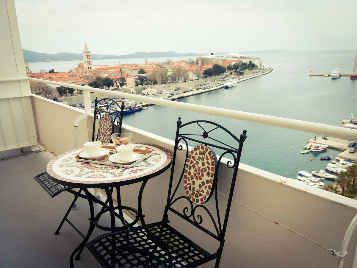 Welcome to this studio apartment, with stunning sea view, in the historical center of Zadar. From bed, it's like in a boat! The accommodation is located at the foot of the famous Sea Organ, the Greeting to the Sun, with this incomparable view of the sunset A parking space is reserved for you in front of the building, on the street side The studio is new, soundproofed, with equipped kitchenette, bathroom with shower and WC, balcony, TV, Wi-Fi, coffee machine The comfort of the bed is guaranteed !