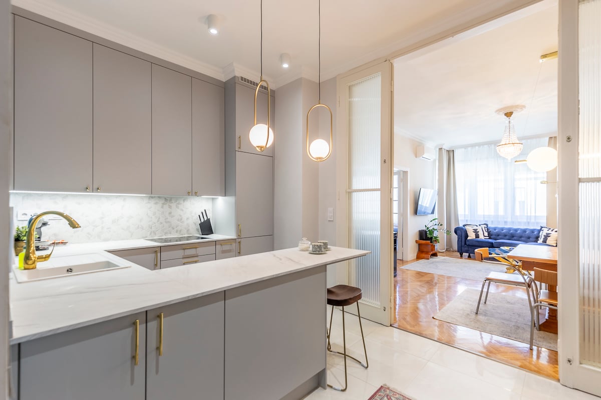 As another gem in our unique apartment collection, we present a brand new home away from home to the discerning Budapest visitor in an unbeatable location. It is stylish, luxurious, comfortable, and true to its environment and the architectural style of the building. It is one of the few genuine Bauhaus buildings in central Budapest, and while, of course, in a modernized way, we tried to stay true to many elements of this influential style when we created this unique apartment.