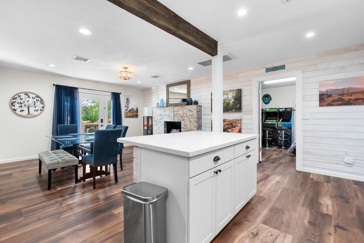 This beautifully remodeled 1914 home is two blocks from Whiskey Row and Downtown Prescott shops, theatres, restaurants, and courthouse square events. Professionally designed inviting home, two bedrooms each with a queen bed, two gorgeous bathrooms each with a full shower and bathtub, and a third private sleeping room with two twin beds. Living room has a grand accent wall, rich furniture, and a warm gas stove for restorative evenings at home. Welcome to Prescott, and welcome to our home.