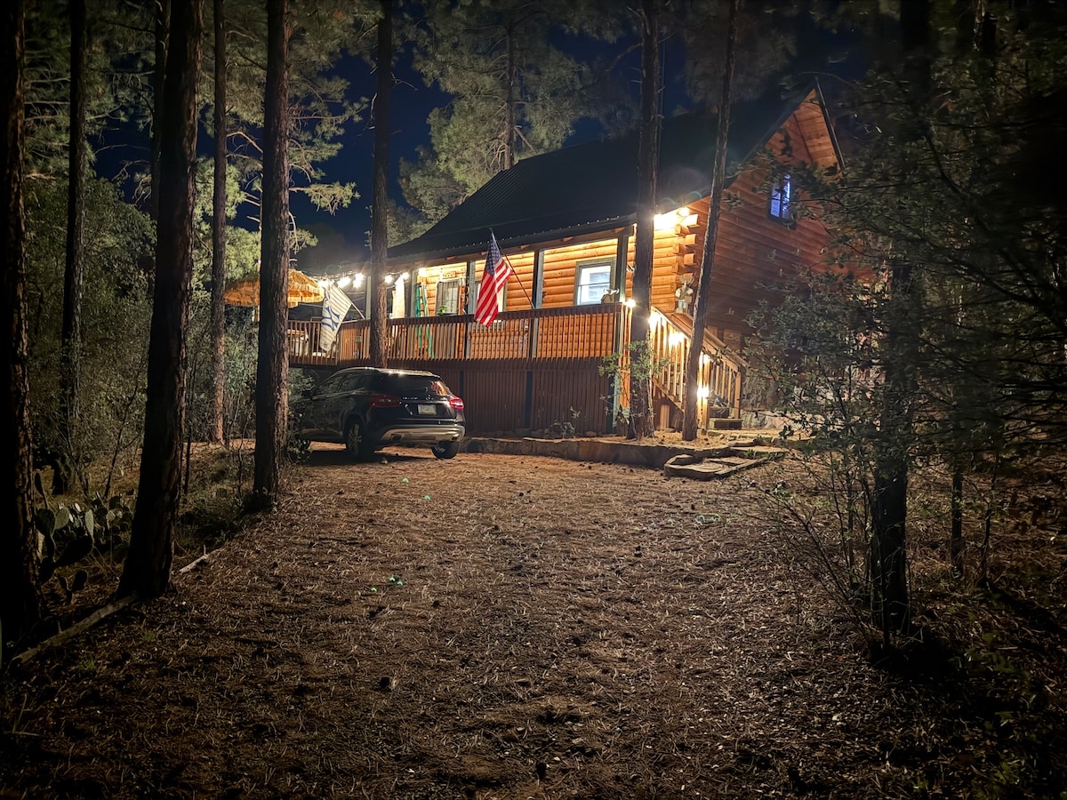 A Magnificent cabin located in the Prescott Pines. This cabin is 10 minutes south of Costco and only a short minute drive on gravel off of Walker Road. A place to be filled with peace and serenity. A cozy, welcoming place to stay. The views of the deck showcase the beautiful pines and your backyard is the Prescott National Forest. This cabin has central A/C and heat, hot tub,internet, TV, appliances, grill, bikes, fooseball, bean bags, horse shoe pits, fishing poles, and kayaks to enjoy.