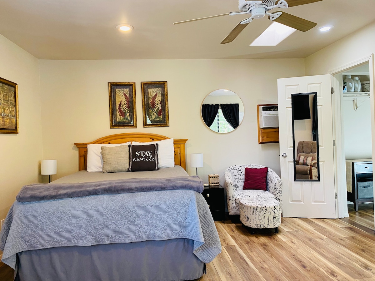 This is a separate & private suite, with free parking & a private entrance. Walking distance to Courthouse/Whiskey Row, about 1.25 miles & Prescott Resort 1 miles. 4.1 miles to Watson lake. Equipped with a full size refrigerator, induction cooktops, oven/air frier, dishwasher, microwave, dinnerware, drinkware & utensils. Also provided are kitchen, and bed & bath linens. Additional pillows, blankets, towels, pack-n-play, iron, picnic basket & more available on request