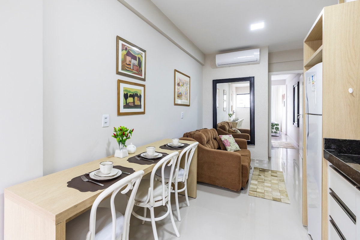 Abrace o aconchego neste lugar projetado com muito cuidado e carinho! Recém finalizado no centro de Foz, perto de tudo o que você precisa para que sua hospedagem seja perfeita. Andando você encontra supermercados, restaurantes, farmácias, posto de combustível, bancos, casa lotérica, cafés, bares noturnos, etc Espaço composto por uma suíte confortável, lavabo, sala de estar/tv/jantar, unificados com uma cozinha compacta e funcional, Na sacada você conta com uma mesa para desfrutar por do sol!