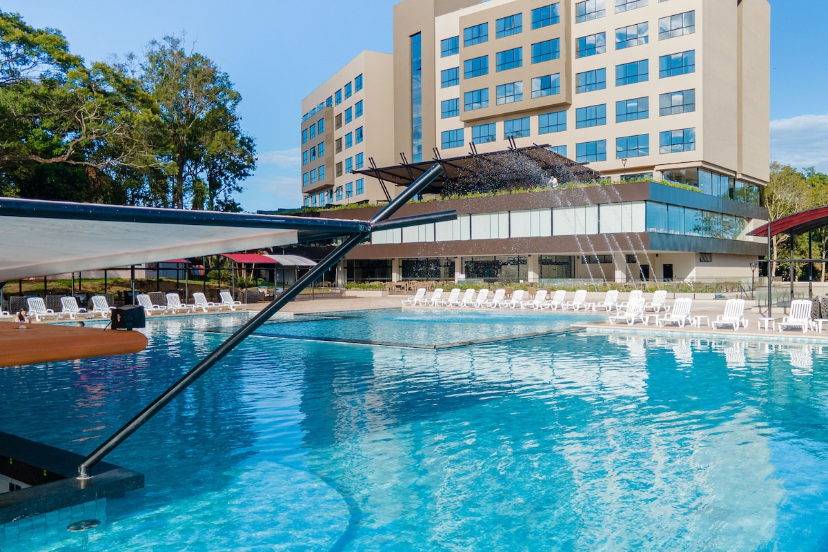 A suíte contém uma cama de casal Queen. Possui Wi-Fi, ar-condicionado, TV smart e cofre. O banheiro privativo inclui toalhas, shampoo, condicionador, sabonete e secador de cabelo. O complexo está localizado na Avenida das Cataratas e oferece facilidades para sua conveniência. No prédio, você encontrará lavanderia self-service, casa de câmbio, agência de turismo, locação de veículos, Subway e conveniência 24 horas com caixa eletrônico para operações bancárias a qualquer momento.