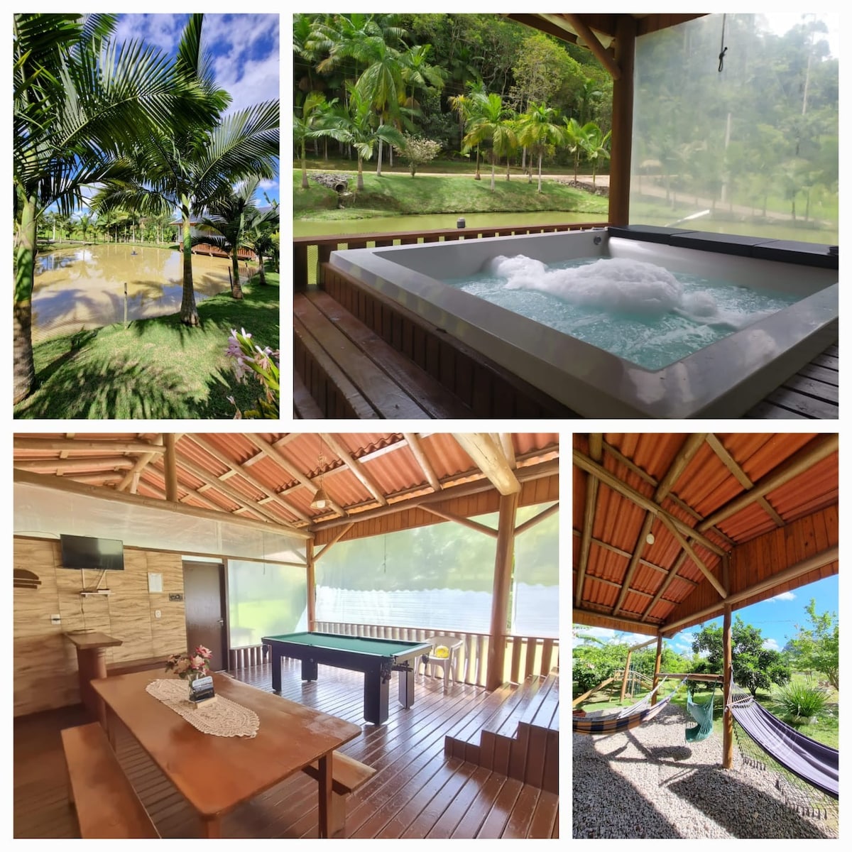 Sinta-se em casa em meio à natureza! Nosso espaço é ideal para famílias e amigos. Imagine reunir todos para um churrasco, se divertir na sinuca e depois relaxar em uma jacuzzi espaçosa, aquecida e com vista para a lagoa, enquanto as crianças brincam no parquinho, se divertem no campinho ou exploram o pomar. As redes convidam ao descanso embalado pelo canto dos pássaros. À noite, a fogueira reúne a todos para assar marshmallows e viver momentos inesquecíveis.