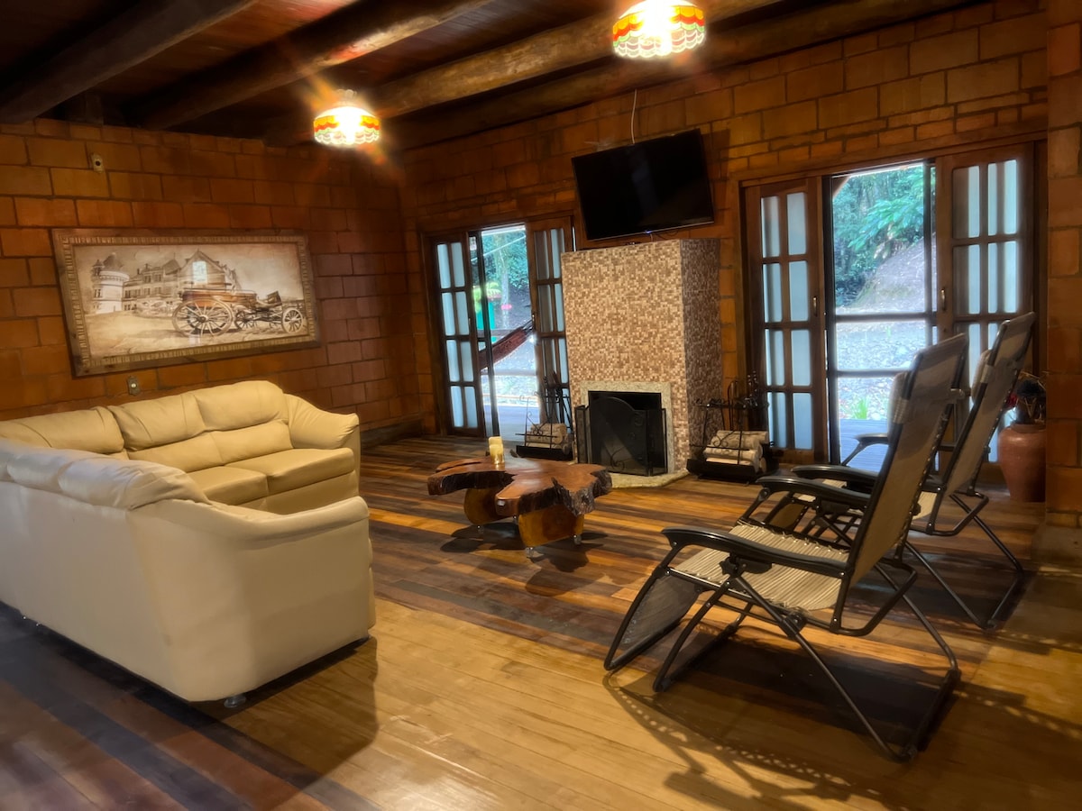Relaxe com toda a família nesta acomodação tranquila. Um lugar em meio a natureza onde você ouve o canto dos pássaros nas arvores em volta da pousada. Aqui você encontra diversos tipos de frutas como: Uva, acerola, tangerina, banana, laranjas, pera... Na parte interna você encontra uma ampla cozinha com churrasqueira, fogão, geladeira, pia e louças em geral. Banheiro e chuveiro privativo, um quarto climatizado com 1 cama de casal e 2 de solteiro.
