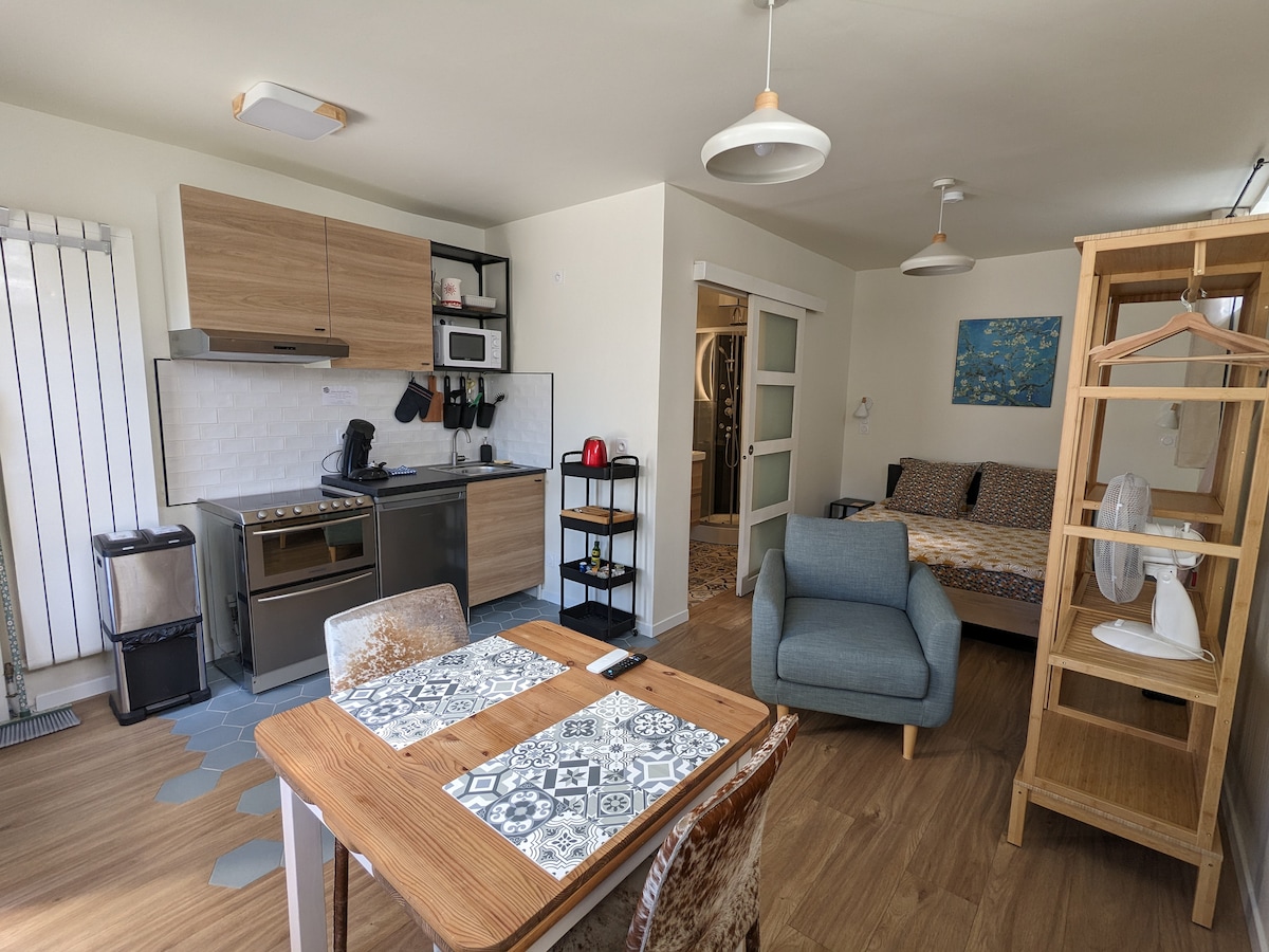 ● T2 entièrement neuf de 45 m2 dans petite copro ●Entrée autonome tres facile d'accès ● 1 stationnement privatif gratuit, si besoin possibilité d'en avoir un 2eme me demander. ●1 lit double 160 et 1 canapé convertible la maison du convertible pour accueillir 4 personnes max ...... ●vue sur jardin privatif ●environnement calme en campagne ●salle de bain avec baignoire ●machine à café dolce gusto ● si disponibilité possibilité d'arriver avant /partir plus tard 8€/ heure , me contacter avant .