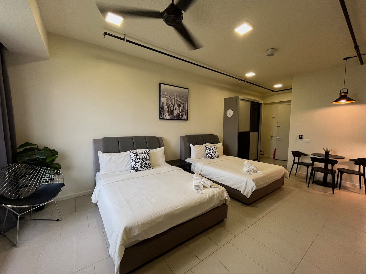 Explore our cozy studio, which can accommodate 2 to 3 people with a queen bed and a sofa bed. Only a 15-minute drive from KLIA T1/T2, the place is surrounded by many restaurants, fast food branches, groceries, and laundry shops, all within walking distance. Savor all the amenities, including the kids’ playground, BBQ area, gym, and swimming pool, with 24/7 security. * Unavailable drop your luggage before check in hours.Due to building designed, need to walk 10 steps staircase to get elevator.