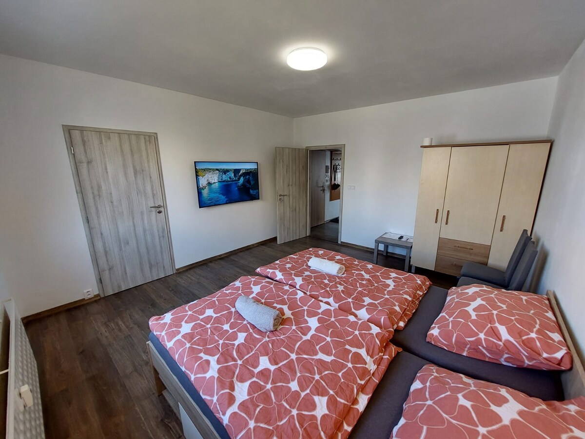 Vitajte v našom praktickom a priestrannom apartmáne vhodnom pre rodiny alebo skupiny až do 7 osôb. Ubytovanie pozostáva z 3 uzamykateľných izieb – ideálne pre tých, ktorí hľadajú kombináciu súkromia a dostupnej ceny. Apartmán má: 1 veľkú izbu (15 m²) s manželskou posteľou a rozkladacou pohovkou, 2 samostatné izby (dokopy 25 m²), každá s manželskou posteľou, Posteľná bielizeň, uteráky a Wi-Fi sú samozrejmosťou. Check-in prebieha samostatne cez kľúčový trezor / podľa dohody.