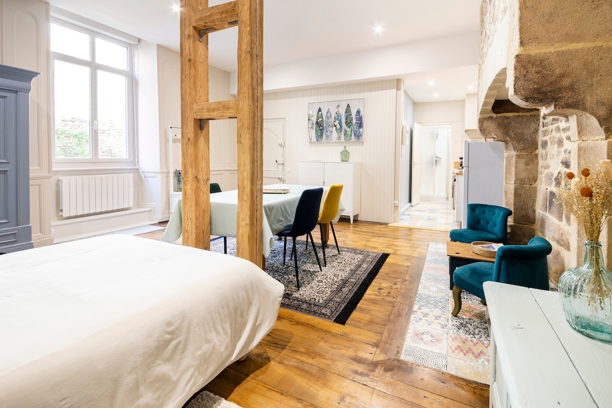 Venez vous détendre dans notre logement alliant le charme et le calme en plein centre historique de Dinan. Posez vos valises dans notre grand studio authentique et moderne de 38 m2 tout récemment rénové au rez de chaussée d'un joli immeuble en pierre donnant sur une cour intérieure. La cuisine neuve est dotée d'un four, micro-ondes, plaques vitro, lave-linge, bouilloire, cafetière, grille-pain. Les draps, serviettes de toilettes et torchons sont fournis. Le lit est fait à votre arrivée.