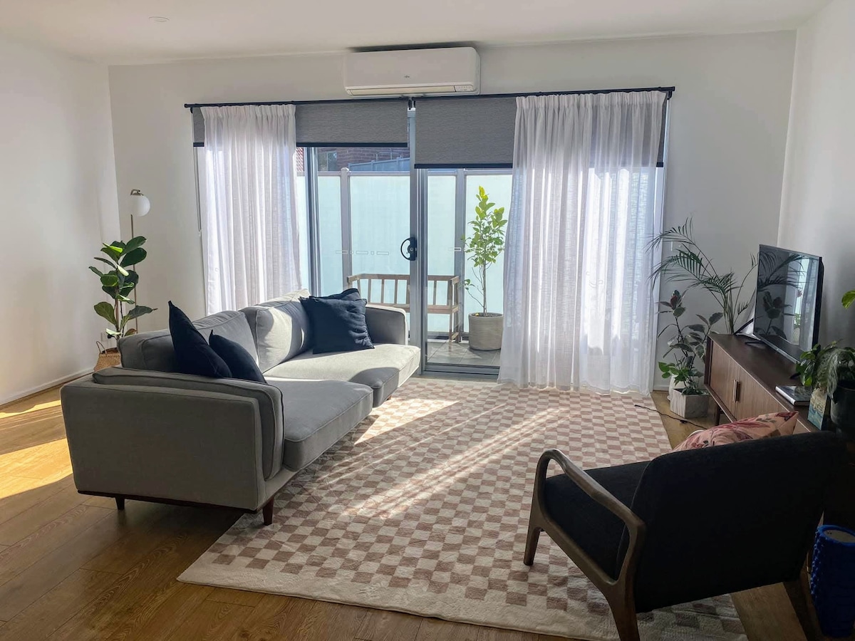Near new townhouse with THREE air conditioners (heating/cooling), one in each room. SOFA BED HAS BEEN REPLACED (now 1.44m x 2m). 2 bedrooms, 2 full bathrooms. KING size bed (1.8m x 2m) in the bedroom upstairs. Two single beds in the bedroom downstairs. Comfy mattresses with pocketed springs and euro tops. 65-inch smart TV Fast WiFi with NBN network. Fully equipped kitchen and quality appliances. Washer & dryer combo machine A balcony to relax and feel the breeze.