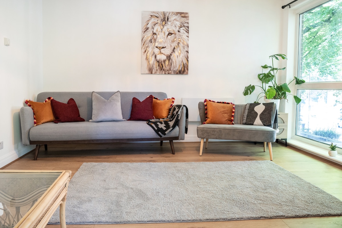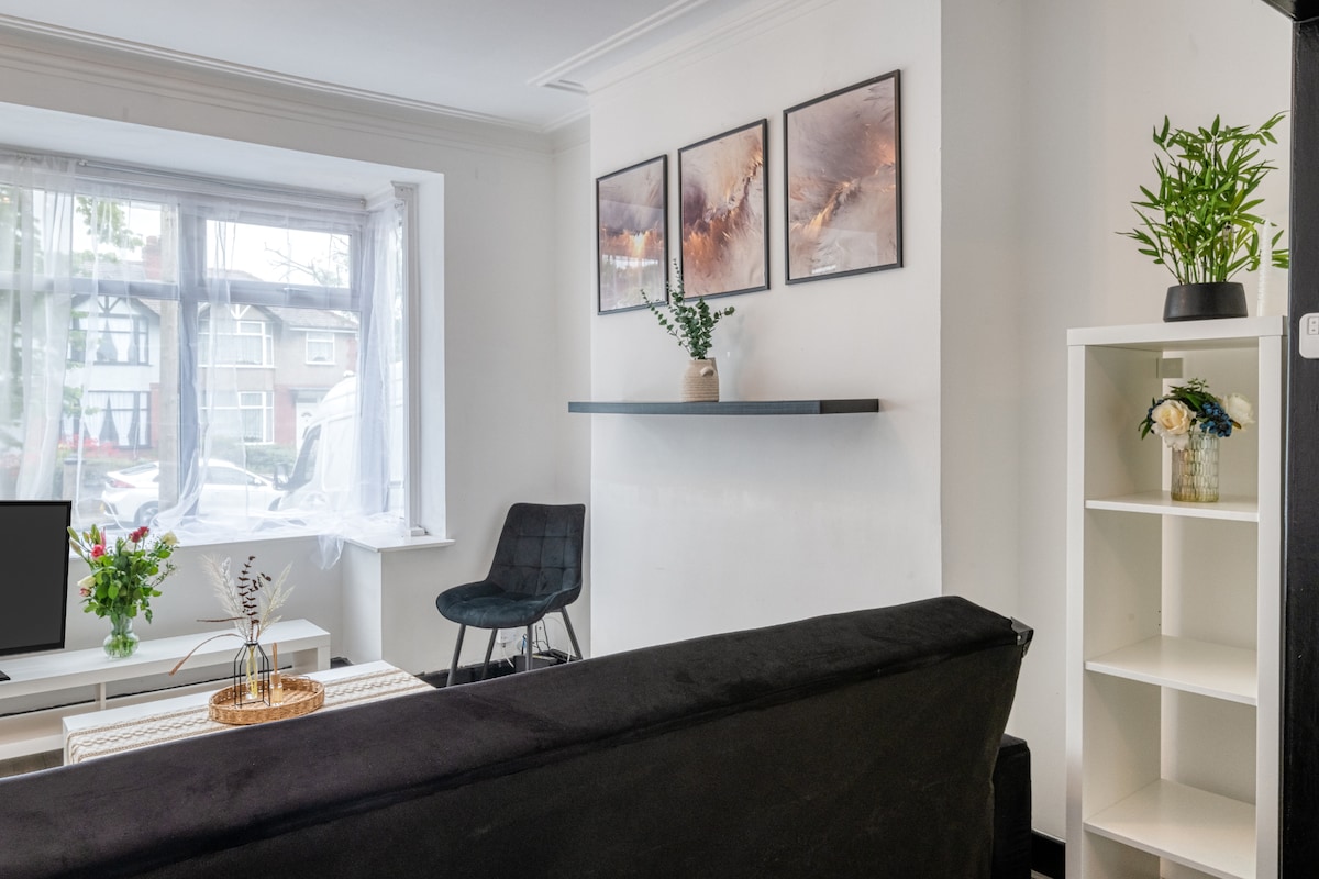 Stylish 2-bedroom ground-floor apartment on a very quiet street in Salford, just a 15-minute drive to Manchester city centre and only a 3-minute walk to the bus stop, Lidl, and local shops. Also only 20 min walk from famous Heaton park.Fully equipped with all essentials, perfect for families with a cot and high chair for toddlers. Bedroom 1 has a king bed, Bedroom 2 a single bed, and the sofa in the lounge converts for a 4th guest. Includes two TVs and a work desk for leisure or business stays.