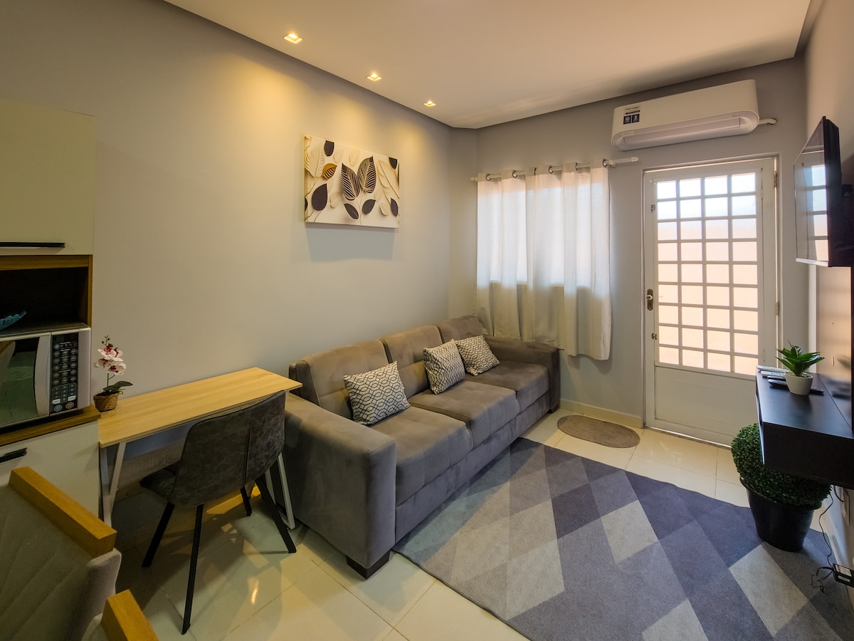 Abrace a simplicidade neste lugar tranquilo e bem-localizado. Temos tudo que você precisa incluindo : Wi-Fi, ar condicionado, chuveiro elétrico e mobília completa! ;) Lugar tranquilo e com segurança, na entrada temos nosso portão eletrônico e câmeras de segurança na entrada :)