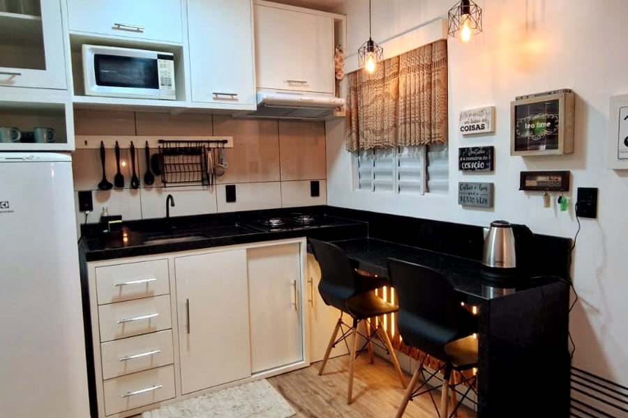 Kitnet confortável e reservada. Fica separada da casa principal, possibilitando a entrada e saída a vontade. Possui um quarto com cama de casal, um banheiro e uma cozinha/sala. Microondas, fogão sem forno, frigobar e cafeteira. Disponibilizamos lençol, travesseiros, toalhas e papel higiênico. Sem chuveiro elétrico no momento e não é permitido cães ou gatos