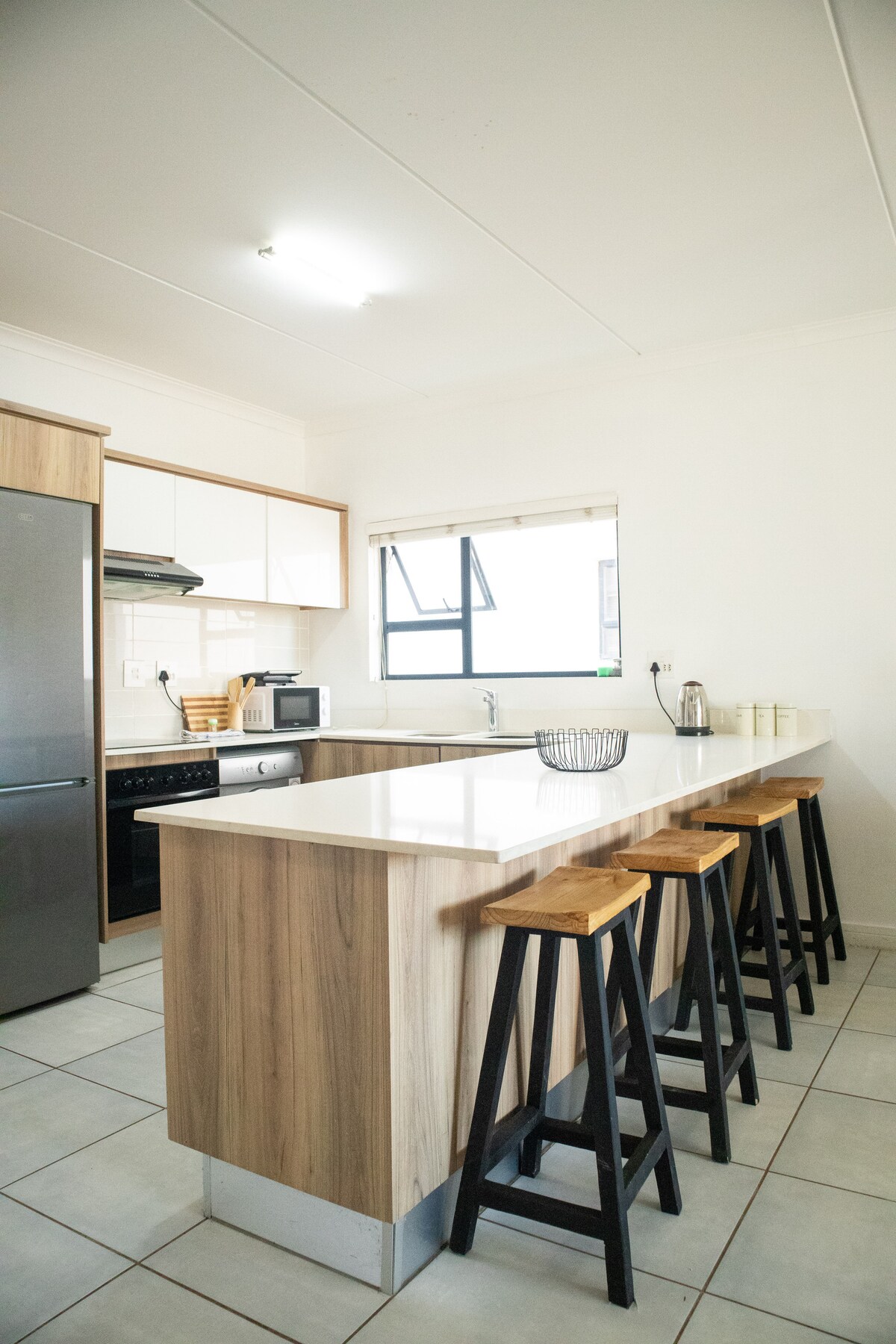 The apartment has a floating double bed and side tables. The lounge has a flat-screen Smart TV that can stream all your favorite movies and series on Netflix, Showmax & Youtube. Our kitchen is fully equipped with a kettle, dishwasher, fridge, microwave, and washing machine. The apartment comes with an idyllic shower. And cute balcony