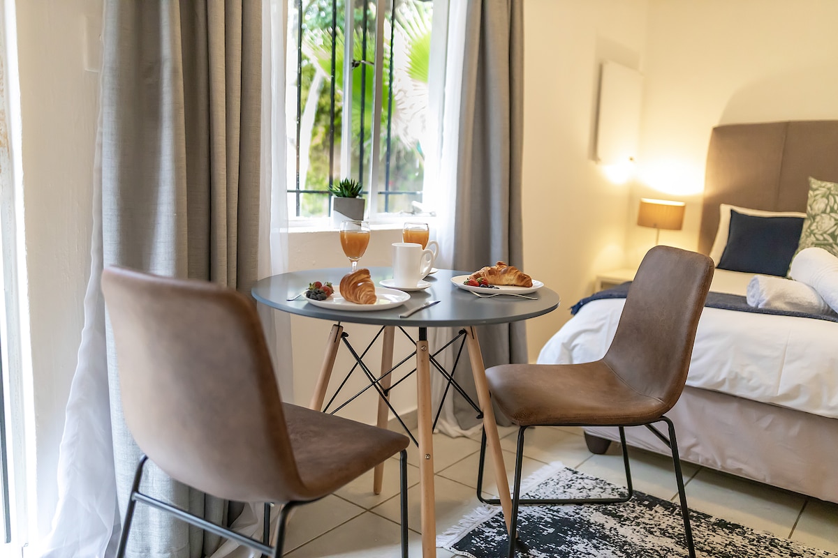 Self-catering Our studios are safe, elegant, and comfortable. Air-con, TV/Netflix, free Wi-Fi, kitchenette with amenities and secure parking. Centrally located in up-market Baileys Muckleneuk. For a romantic break or business trip. Relax after a long day with a cup of coffee in our serene garden under our decade old trees. Walking to Affies Sports Grounds 400m Loftus Versveld 1.2km Tuks 1.6km Boys High 1.4km Hospitals - Groenkloof, Zuid-Afrikaans and Jacaranda 2km UNISA 2.9km ID REQUIRED