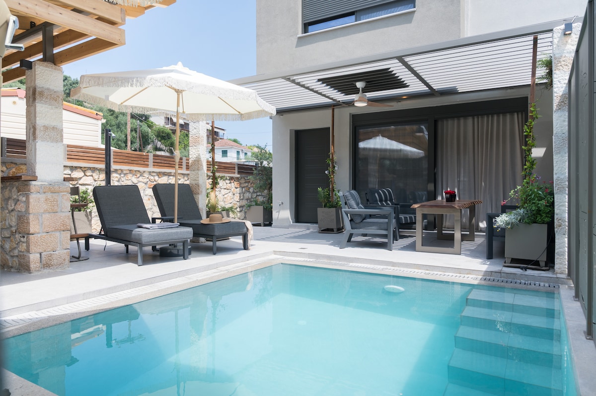 The villa's spacious and beautifully landscaped outdoor area is ideal for relaxation and fun.You can enjoy a BBQ,savoring delicious meals in the open air,and unwind by the private pool with a glass of exquisite greek wine.Inside,the villa is designed with your comfort in mind.Modern amenities and tasteful décor make it a lovely retreat,whether you're here for a romantic escape,a family vacation,or a trip with friends.The tranquil atmosphere n luxurious setting create an unforgettable experience
