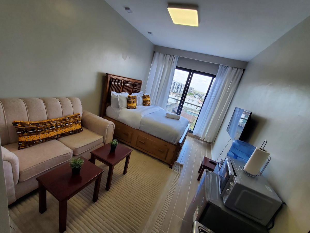 Karibu to your cozy studio ideal for layovers or extended stays. Just 9.5km to JKIA, 4.7km to SGR Station, 3.3km to Gateway Mall & 4km to the Expressway linking to westlands, 16km(toll charges apply). Relax on your private balcony with pool views/enjoy the swimming pool & poolside gym all included at no extra cost. It features a kitchen, Wi-Fi, smart TV, sound system, elevator, free parking & 24/7 security. It's safe to self-check in even late at night. Enjoy complimentary Kenyan tea & coffee.