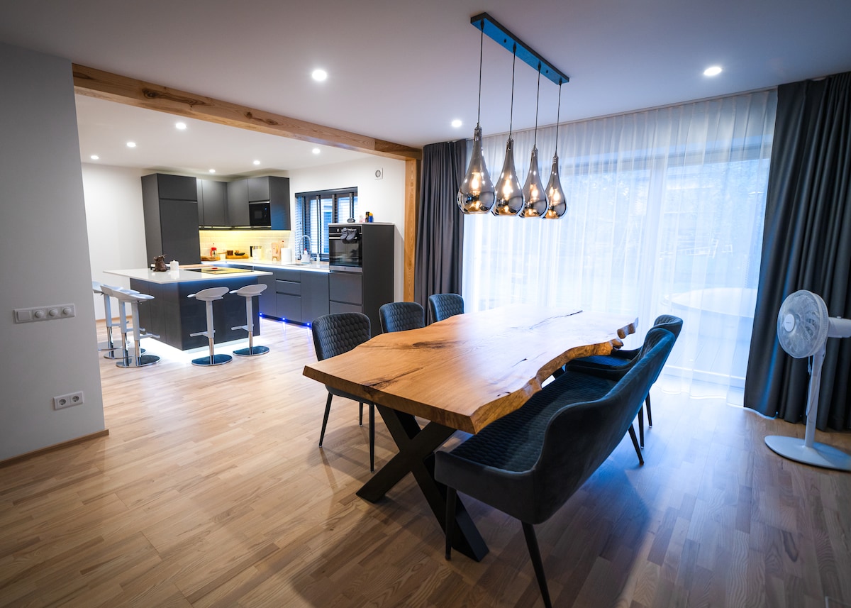 Cosy, calm and modern holiday house with sauna and hot tub with jacuzzi. Location only 4 km from city centre in the middle of forest. We offer comfortable and silent stay outside of the city. Holiday house is equipped with all necessary things to stay- heating, AC, well equipped kitchen, WC, shower, smart TV, free car parking. One double bed is located on loft, and foldable sofa is located in living room. Sauna and hot tub is for extra charge- bathtub 60EUR, Sauna 30 EUR. Pets are not allowed!