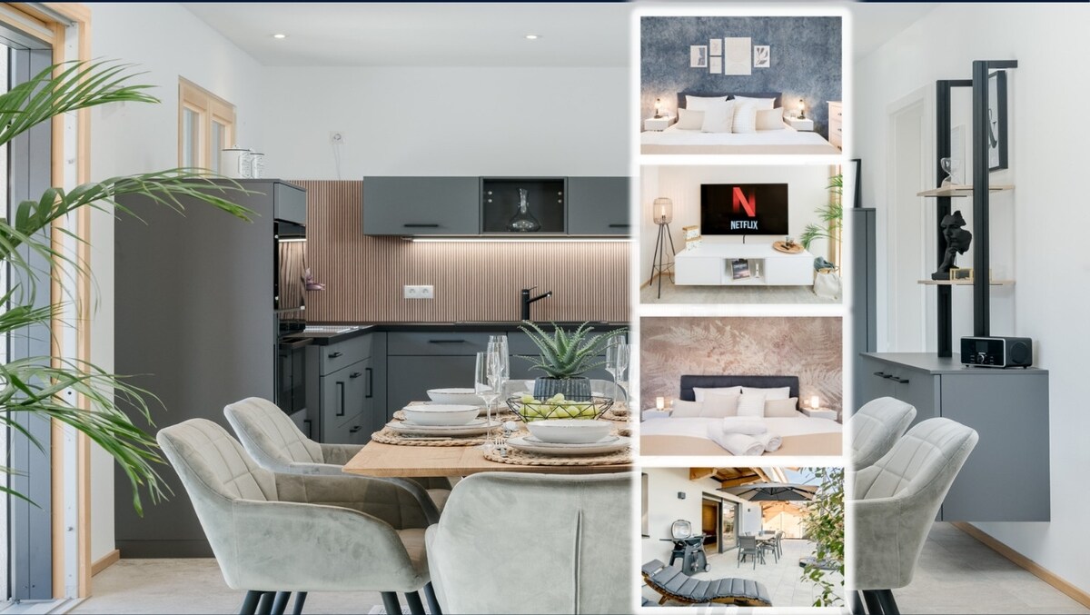 Welcome to our luxury apartment with an enchanting garden oasis. Nestled in the heart of Chiemgau with views of the mountains, this exclusive apartment promises an unforgettable stay. The living area is a harmonious mix of soft seating adorned with elegant decor, creating an inviting space to relax. Floor-to-ceiling windows offer panoramic views of the surrounding greenery and allow natural light to flood into the room.