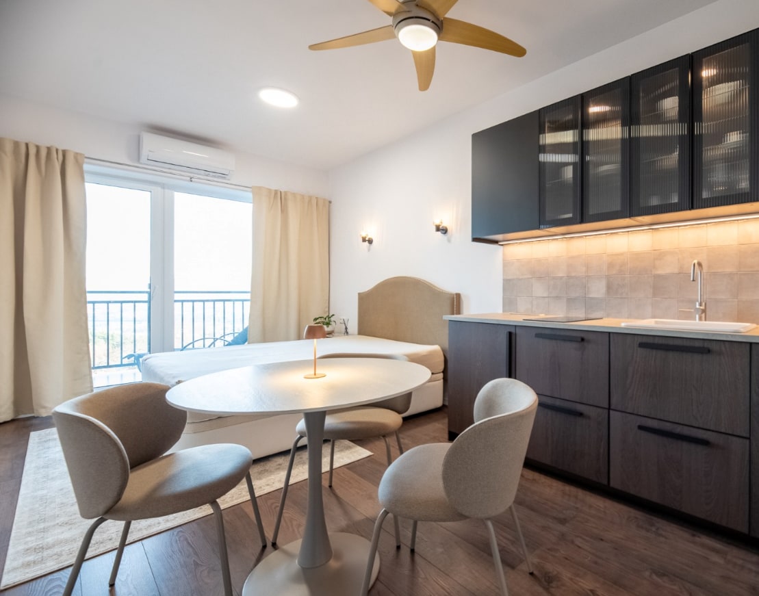 Apartmán s balkónom je v tichej časti mesta. V spálni sa nachádzajú 3 pevné lôžka, LCD televízor a klimatizácia. V obývacej časti je rozkladací gauč, LCD televízor, kuchynka a samostatná kúpeľňa so sprchovacím kútom a WC. Apartmán je taktiež vybavený balkónom. Parkovanie je zriadené vo dvore, na ktorom sa nachádza aj posedenie a ihrisko pre deti.