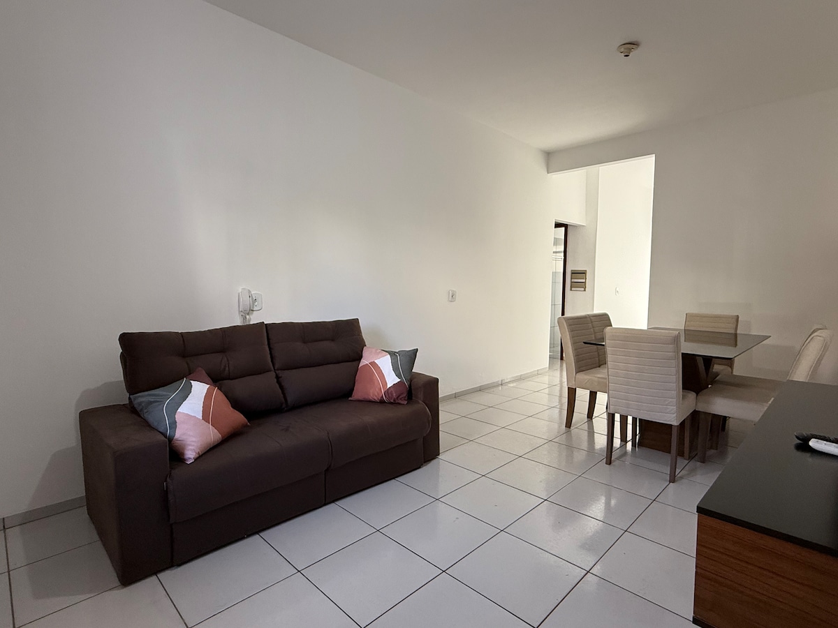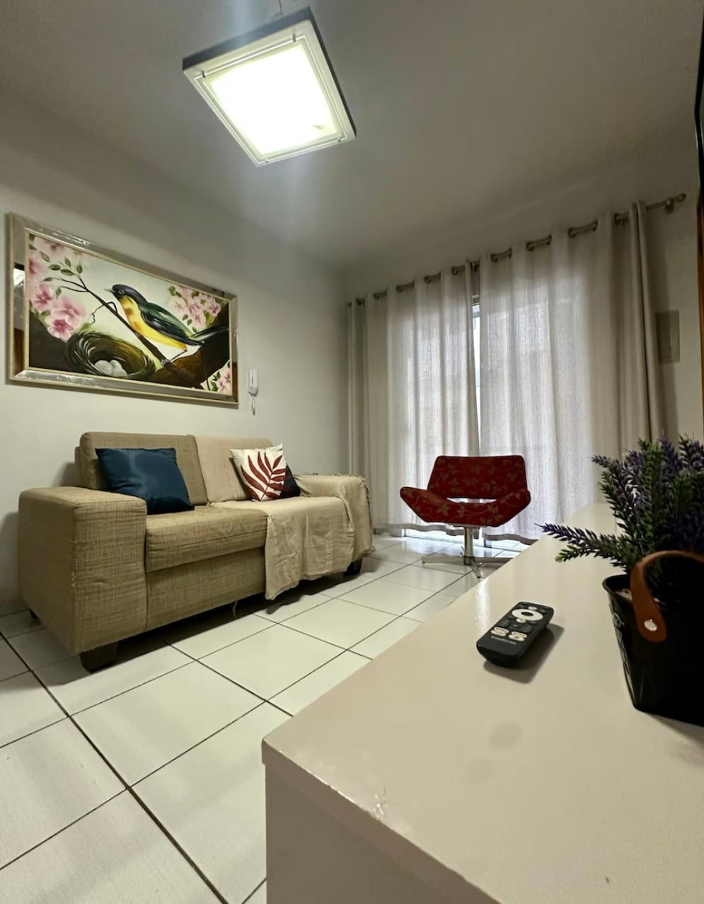 Apartamento de 37 m² completamente mobiliado, contendo 1 (um) quarto com duas camas de solteiro ou uma cama de casal e guarda-roupas, lavanderia contendo um tanque, maquina de lavar roupas e uma armário, sala com sofá e tv, cozinha americana com geladeira, forno micro-ondas e cooktop, e banheiro.