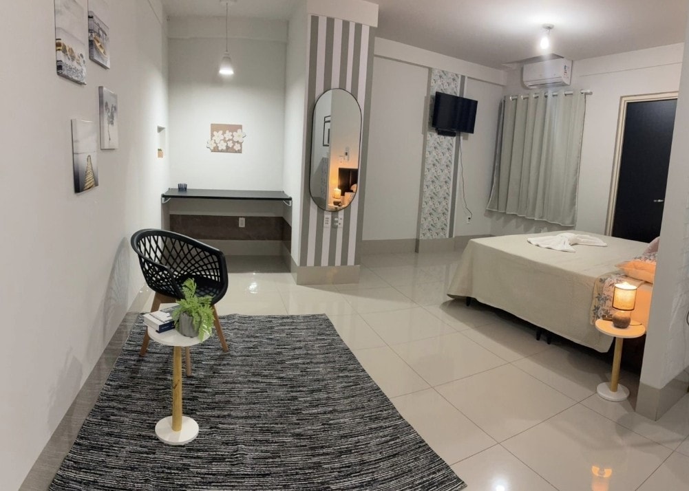 Estamos bem localizado, apartamento completo Suite com cama Queen Sala contém um sofá cama , Tv, ar condicionado Cozinha completa para fazer suas refeições Ambiente bem reservado de alto Padrão . ⛔️Proibido a entrada de animais de estimação Esqueça de suas preocupações neste lugar espaçoso e tranquilo.