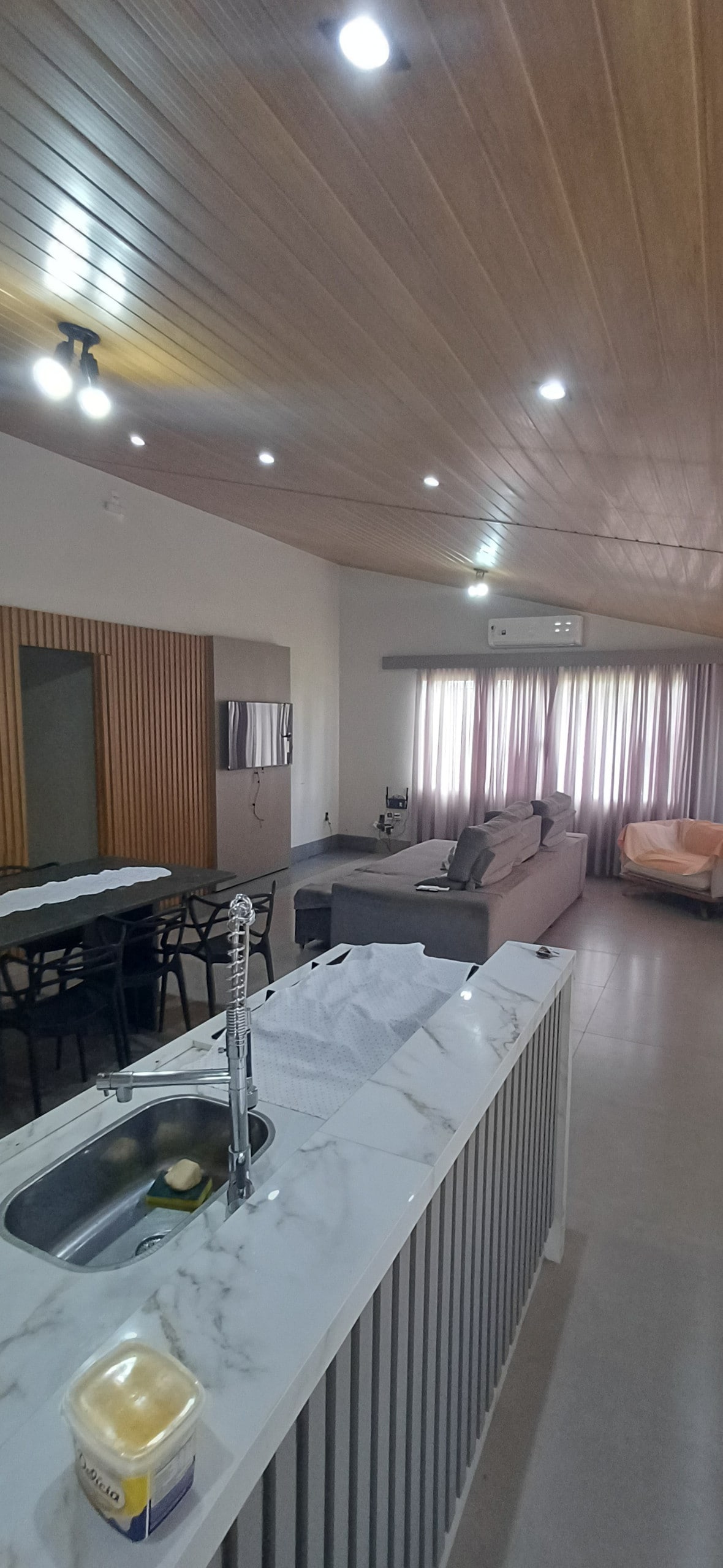 ✨ 4 quartos confortáveis (sendo 2 suítes espaçosas) ✨ Área gourmet completa com banheiro de apoio, churrasqueira e cozinha planejada com ilha central ✨ Ampla área de convivência com TV de 65”, mesa rústica de madeira, redes e balanço ✨ Sala interna aconchegante com espaço home office ✨ Quintal grande e arejado, com pergolado de madeira, bancos e iluminação acolhedora ✨ Lavanderia completa para sua praticidade ✨ Estacionamento para até 5 carros ✨ Casa segura, com grades altas e portão eletrônico