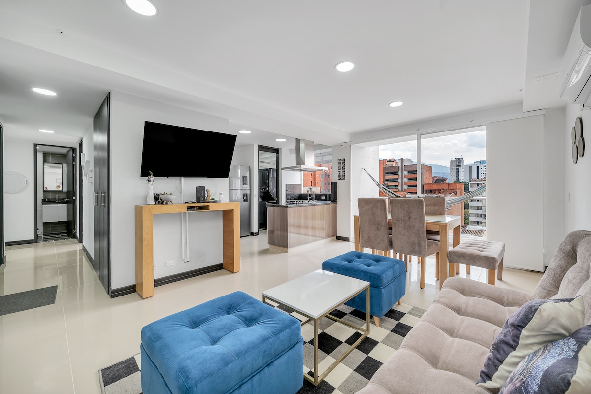 Indulge in Medellín from this exclusive studio with a private skyline jacuzzi, king bed, A/C, and breathtaking city views — the ultimate retreat for elegance, comfort, and vibrant nightlife. Nestled in El Poblado, steps from Provenza’s restaurants, rooftop bars, cafés, and galleries, with Parque Lleras nightlife minutes away. Enjoy 54" smart TV with Netflix, high-speed Wi-Fi workspace, kitchen, washer/dryer, gym, sauna, pool, and on-site bars, restaurants, and gallery.