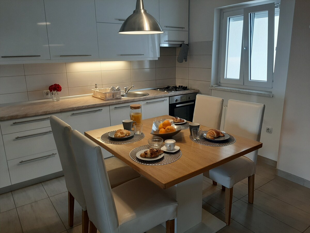 Apartments Nadia are located on the first floor of a family house. Recently furnished, modern apartment offers you comfort for a pleasant stay. There is an olive grove around the house where your children can play and a barbecue for shared use. On same floor is possible to book other apartment big terrace/sea-view. The beach is about 600m (air distance) from the house, with parking, natural surroundings and bar. I look forward to welcoming you in this modern and stylish apartment!