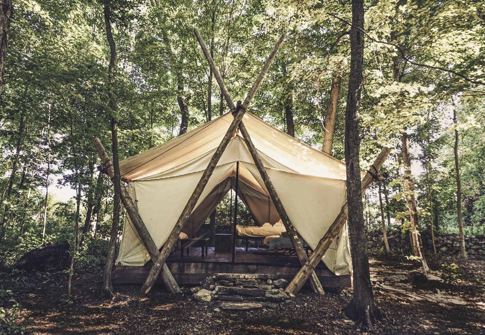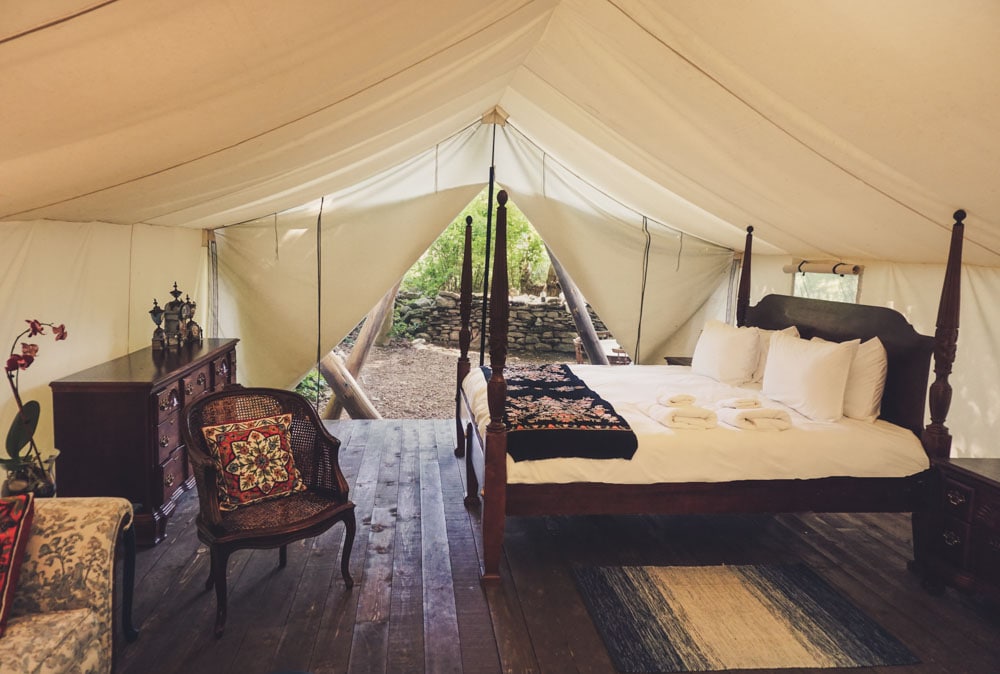 This tent will transport you to a time when people yearned for a deeper connection with the great outdoors, using canvas tents as a simple and elegant way to stay close to nature. The tent features natural materials such as cedar logs, bark, leather and stone, creating a warm and inviting ambiance. The Royal Coachman tent offers a nostalgic glimpse into the late 19th century. Experience the pinnacle of camping luxury with this exquisite tent!