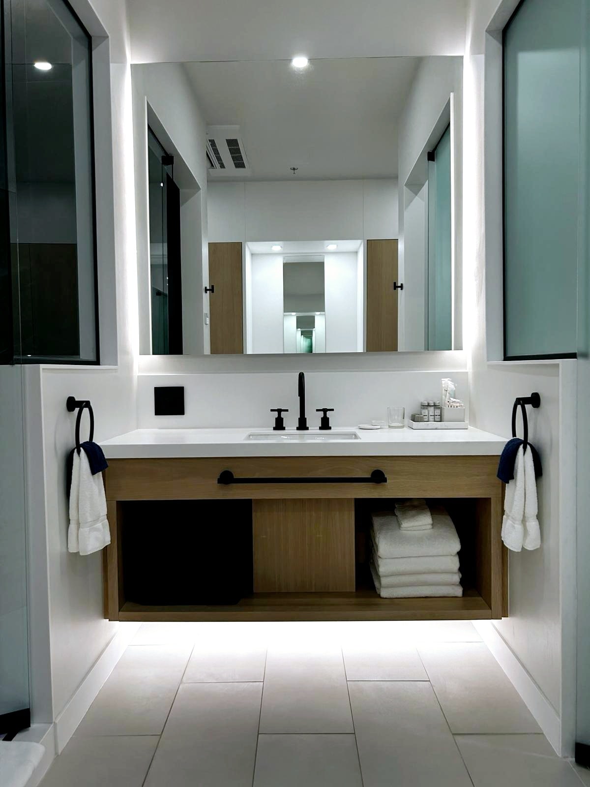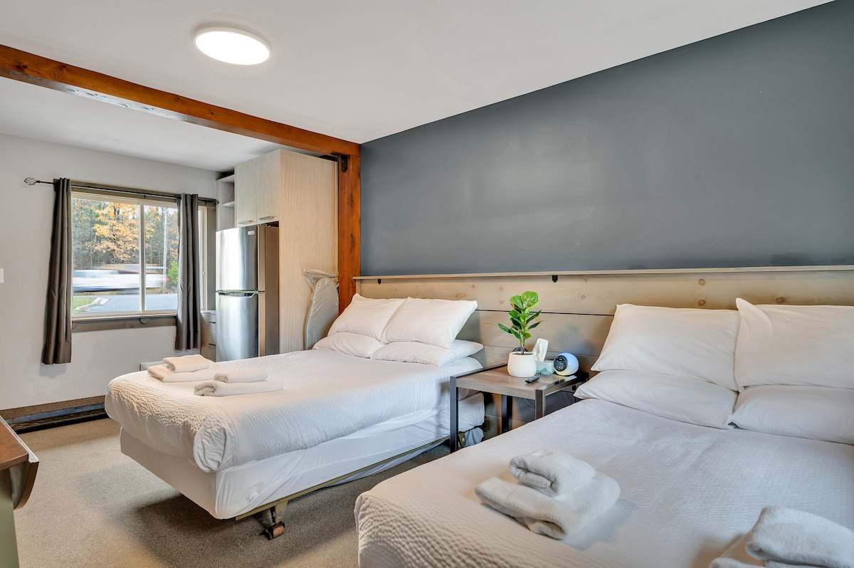 This 447 sq ft suite features two queen beds for group travellers or those who just want their own space. Suite 5 has a walk in shower with a large window to the bedroom (privacy blind), allowing maximum light to flow through, a separate water closet, radiant floor heating, ambient fireplace, work station, 75" smart tv, make-up station, and mini-bar. The bathroom area has a room dividing curtain for added privacy from the sleeping area.