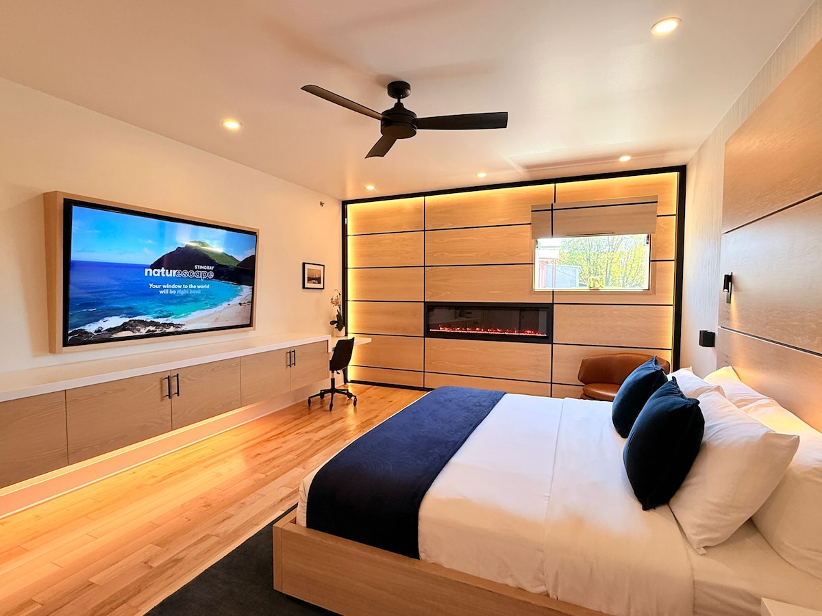 Suite 4 boasts 447 sq ft, featuring, two queen beds, perfect for group travelers or those who prefer extra space, walk-in shower with a large window, (complete with a privacy blind), allowing maximum light to flow. Enjoy the convenience of a separate water closet, radiant floor heating, ambient fireplace, work station, 75" smart TV, a make-up station, and a mini-bar. For added privacy, the bathroom area features a room-dividing curtain separating it from the sleeping area.
