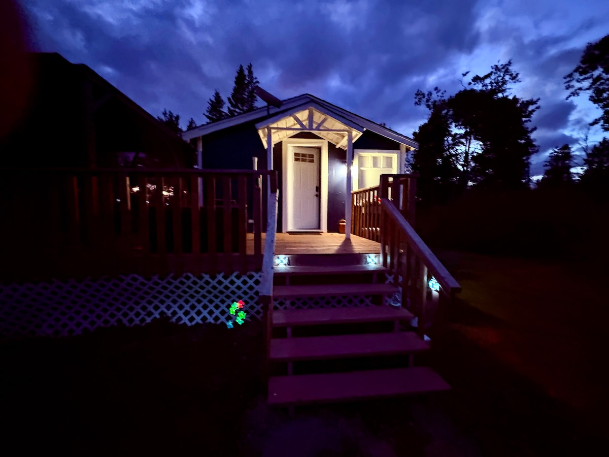Inspired by Mother Goose, or the figures one holds dear. A place for her to rest after a long fairy tale journey. A place to remember and cherish her mementos and treasures she has collected along the way. A cabin and space that embraces both creativity and comfort. Filled with antiques and refurbished furniture, pianos, and organs. This is our third cabin we have installed on our four acre property. There is an exclusive 6 person hot tub off the veranda and the sauna is only steps away.