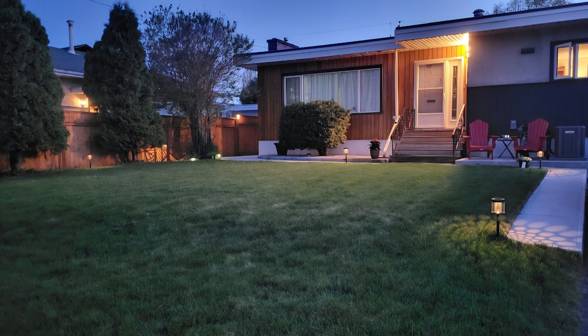 Less than a 10 minute walk to the hospital, grocery store, downtown shopping and many restaurants. This is a basement suite with free parking behind the home, a separate entrance, in suite laundry, queen bed and fouton, and fully equipped kitchen with a gas range, coffee maker, dishwasher, all utensils, pots/pans, and china you need. There is a park, tennis courts and play ground just a block away. You can enjoy outdoor dining in the fully fenced backyard surrounded by green hedges